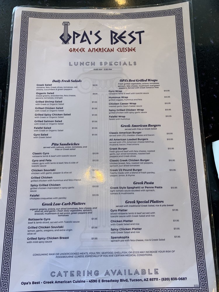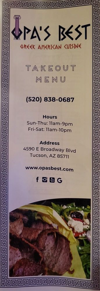 Located in Tucson, AZ, Opa’s Best Greek American Cuisine offers a diverse menu featuring traditional Greek and Mediterranean dishes. With options for vegan, vegetarian, and low-carb diets, this restaurant caters to a wide range of preferences. From classic gyro sandwiches to flavorful grilled wraps and fresh salads, Opa’s menu is sure to satisfy any craving.